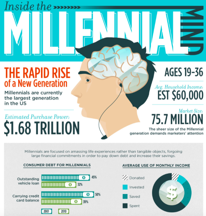 The Millennial generation is a fascinating one, not only due to its sheer size and power (its consists of almost 80 million people, surpassing even Baby Boomers, with an estimated purchasing power of $1.68 trillion), but also due to its distinction from previous generations. In part attributable to the unfavorable economic outlook that members of this generation faced upon reaching adulthood, many have adopted a less traditional approach to life that includes a “unique sense of self” and “surprisingly optimistic outlook on life” according to a Forbes Magazine article. For this article, Millennials are defined as 19-36 year olds.