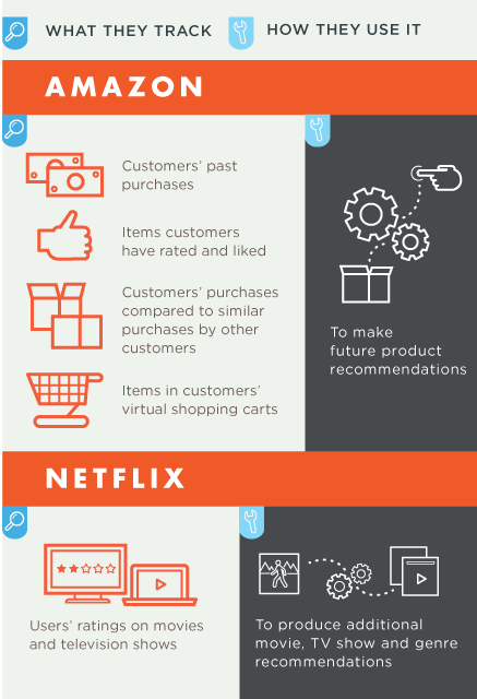 Predictive analytic tools have helped to directly increase sales. Amazon, for example, notes that its recommendations engine roughly accounts for 30% of the company’s sales. Amazon tracks customer’s last purchases, items that customers have rated and liked, customers purchases compared to similar purchases by other customers, and items in customers wish or shopping lists, to produce personalized recommendations. Additionally, Netflix has used predictive analytic tools to suggest movies for viewers to watch next by using past viewed movies and through the correlation of preferences of other viewers with similar tastes.
