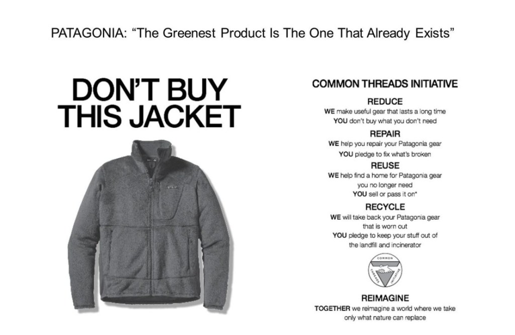 Patagonia has continued this style of ads, and in 2017, they introduced the ability to turn in used Patagonia merchandise that was in good condition for credit towards a new piece of Patagonia clothing. The used Patagonia clothing is washed, repaired, and sold on Patagonia’s “Worn Wear” website [17]. These options are typically priced lower than brand new Patagonia clothing which can be appealing to consumers on a tighter budget, and they also allow environmentally conscious consumers to buy the brand-name clothing in an even more sustainable way [18].